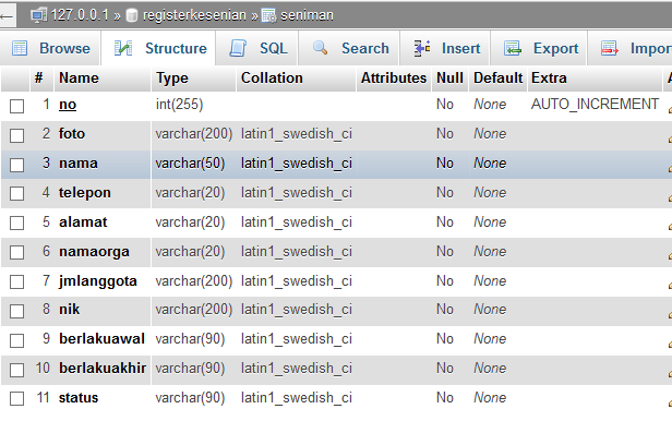 1. Buat DataBase dengan Nama Registerkesenian  dan Buat Tabel bernama Seniman , dalam tabel Seniman kita isikan 11 Field yang terdiri dari no, foto, nama, telepon, alamat, namaorganisasi, jmlanggota, nomorindukkesenian, berlakuawal, berlakuakhir dan status dengan tipe data Varchar dan no sebagai AutoIncrement tipe data Integer ( Klik Gambar untuk memperbesar )